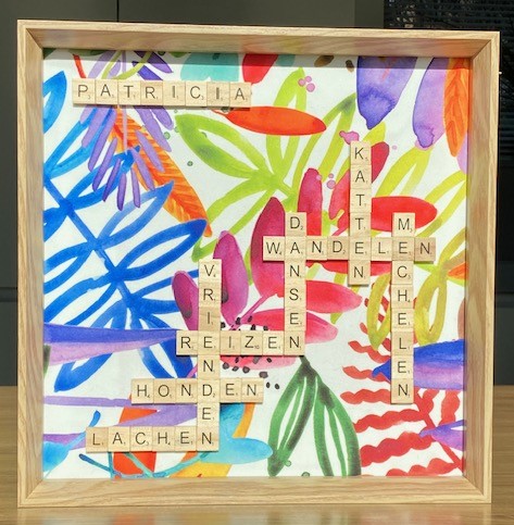 Laat een kader maken met de naam van de persoon voor wie het cadeau bestemd is in de linker hoek, met daarnaast een raster gelegd in Scrabble-blokjes, met woorden die die persoon typeren.